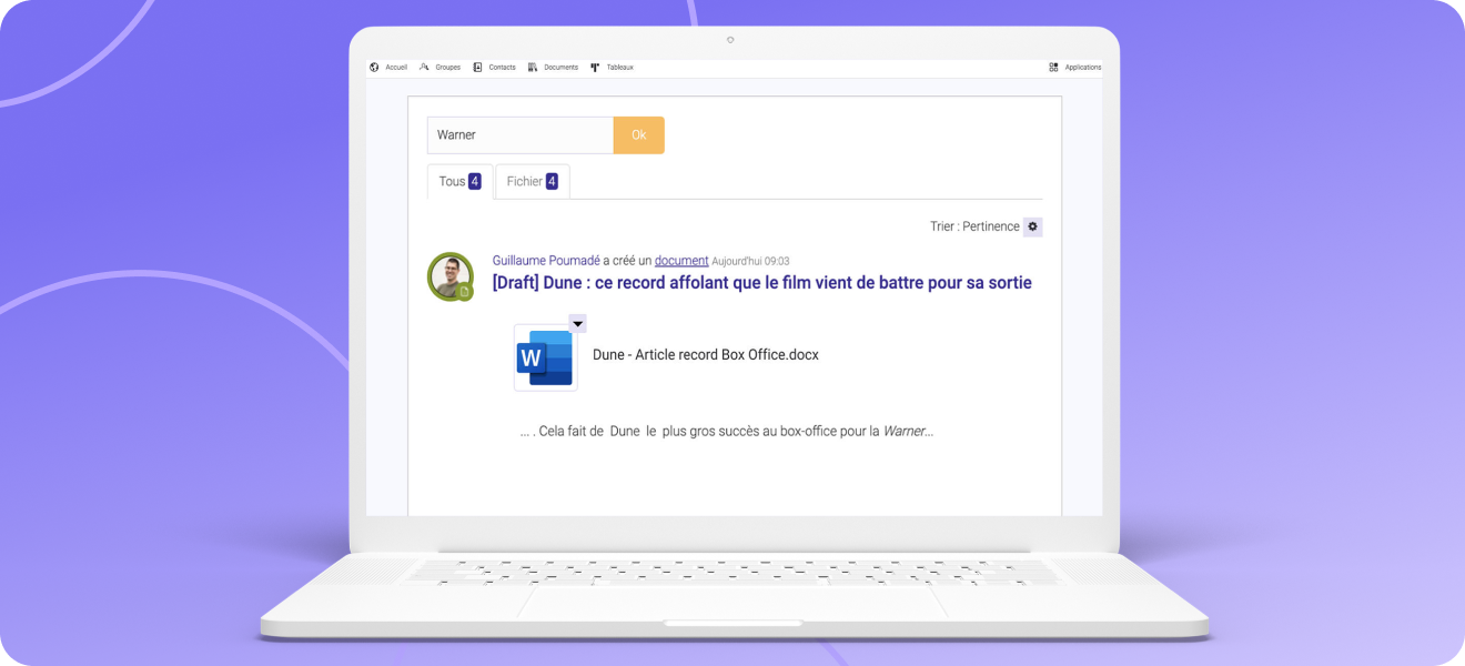 Grâce au moteur de recherche Jamespot, retrouvez n’importe quel document en quelques clics : par titre, contenu ou auteur.